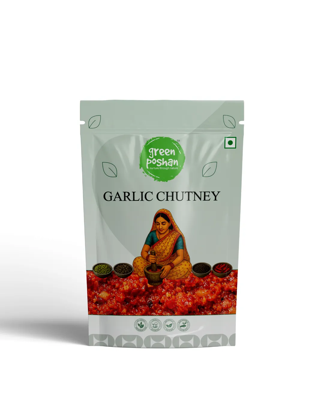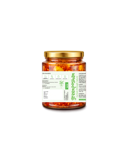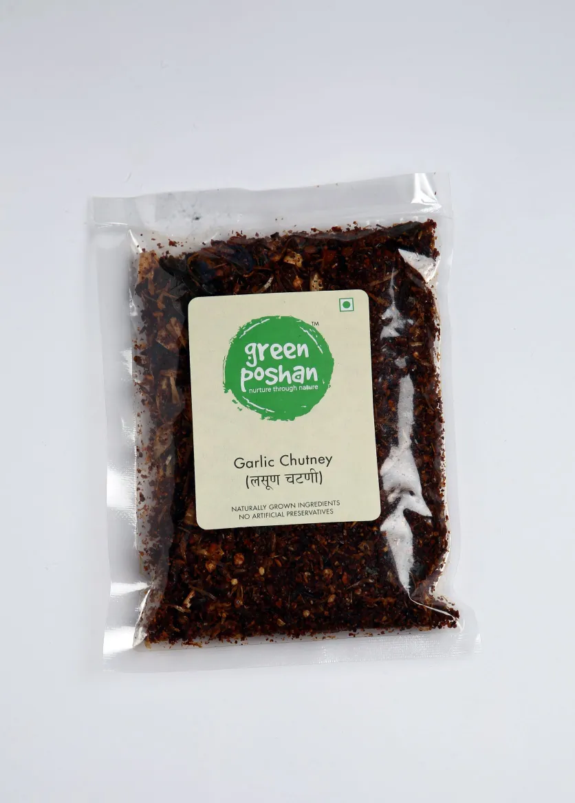 GreenPoshan’s Garlic chutney, a spicy condiment is crafted by blending garlic cloves with red chilies, lending it a bold and pungent flavor. Often seasoned with additional spices and oil or curd, this chutney complements a variety of dishes, as well as wholesome meal. With its aromatic intensity and zest, garlic chutney can be used as condiment as well as additive to enhance taste in various cuisines.