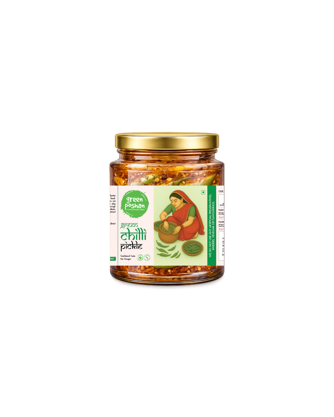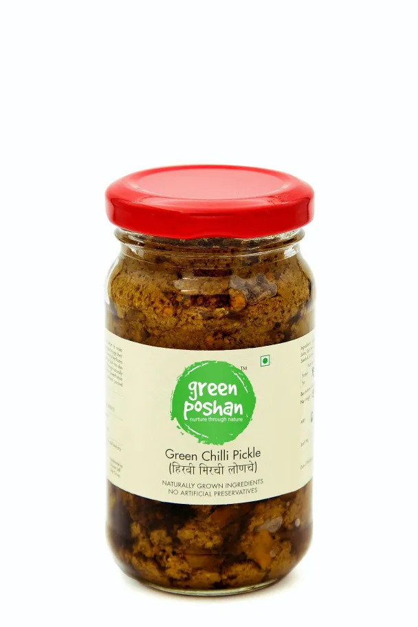 GreenPoshan’s Green chili pickle is a tantalizing condiment, combining fresh green chilies with tangy ingredients like lemon juice without use of any synthetic preservatives. Infused with aromatic spices, this pickle strikes a perfect balance between heat and acidity, adding a zesty kick to meals. Known for its bold flavor, this pickle enhances the taste of rice, and snacks, offering a delightful and fiery culinary experience.