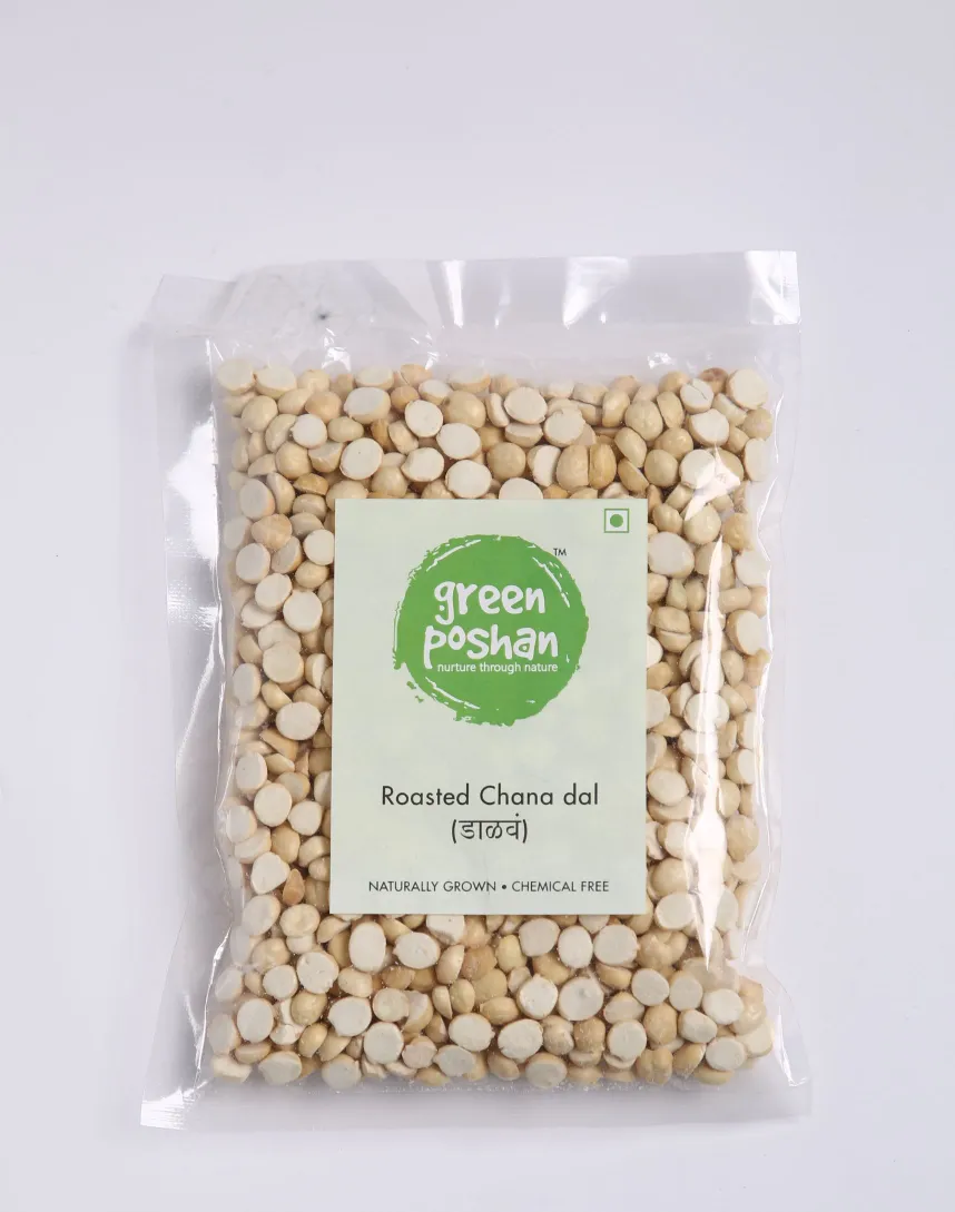 Looking to buy premium organic roasted chana dal online? Green Poshan brings you the finest roasted chana dal, packed with 22g of protein per 100g and dry roasted without oil or chemicals. Our naturally grown chana dal (split Bengal gram) is perfect for health-conscious families seeking nutritious snacking options.